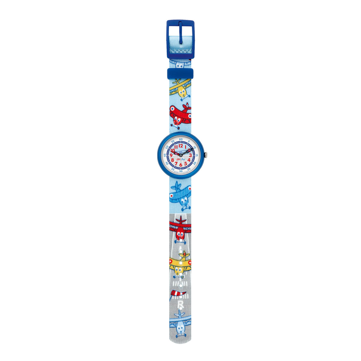Đồng hồ bé trai FLIK FLAK FBN060 thiết kế dây đeo với màu xanh da trời cùng với những chiếc máy bay vui vẻ. Các nhà thiết kế của hãng FLIK FLAK còn thiết kế mặt đồng hồ theo phong cách buồng lái máy bay với hai kim chỉ giờ chỉ phút gắn hai nhân vật FLIK và FLAK. Đồng hồ cũng được trang bị khả năng chống sốc và chống nước cơ bản.