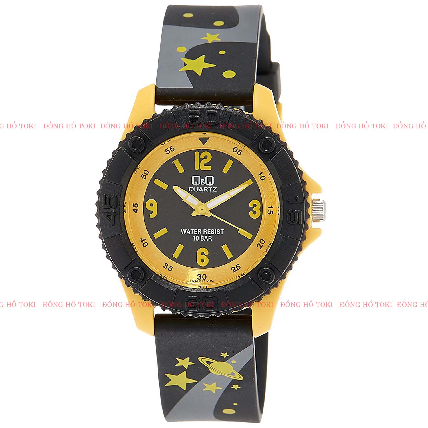 Đồng hồ Q&Q Citizen VQ96J là một mẫu đồng hồ cá tính dành cho trẻ em với rất nhiều màu sắc cho các bé lựa chọn và VQ96J-017Y là một trong số đó, chiếc đồng hồ với màu đen viền vàng phù hợp với các bé trai. Đồng hồ nhẹ với dây nhựa mềm giúp thoải mái hơn khi đeo. Đồng hồ chống nước tốt có thể sử dụng khi đi bơi.