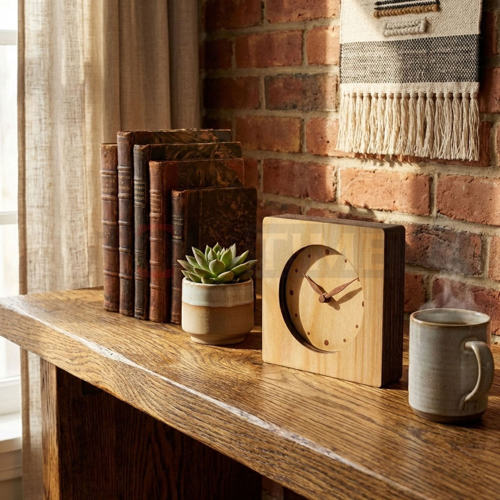 - Thiết kế tối giản nhưng đầy chiều sâu Ấn tượng đầu tiên về chiếc đồng hồ này là cấu trúc hình vuông vững chãi bao bọc lấy mặt số tròn mềm mại. Điểm nhấn đặc biệt nằm ở phần viền đồng hồ được thiết kế theo dạng "bậc thang" xếp lớp. Những vòng gỗ đồng tâm tạo nên chiều sâu thị giác, khiến mặt đồng hồ như một tác phẩm nghệ thuật 3D đầy thu hút.