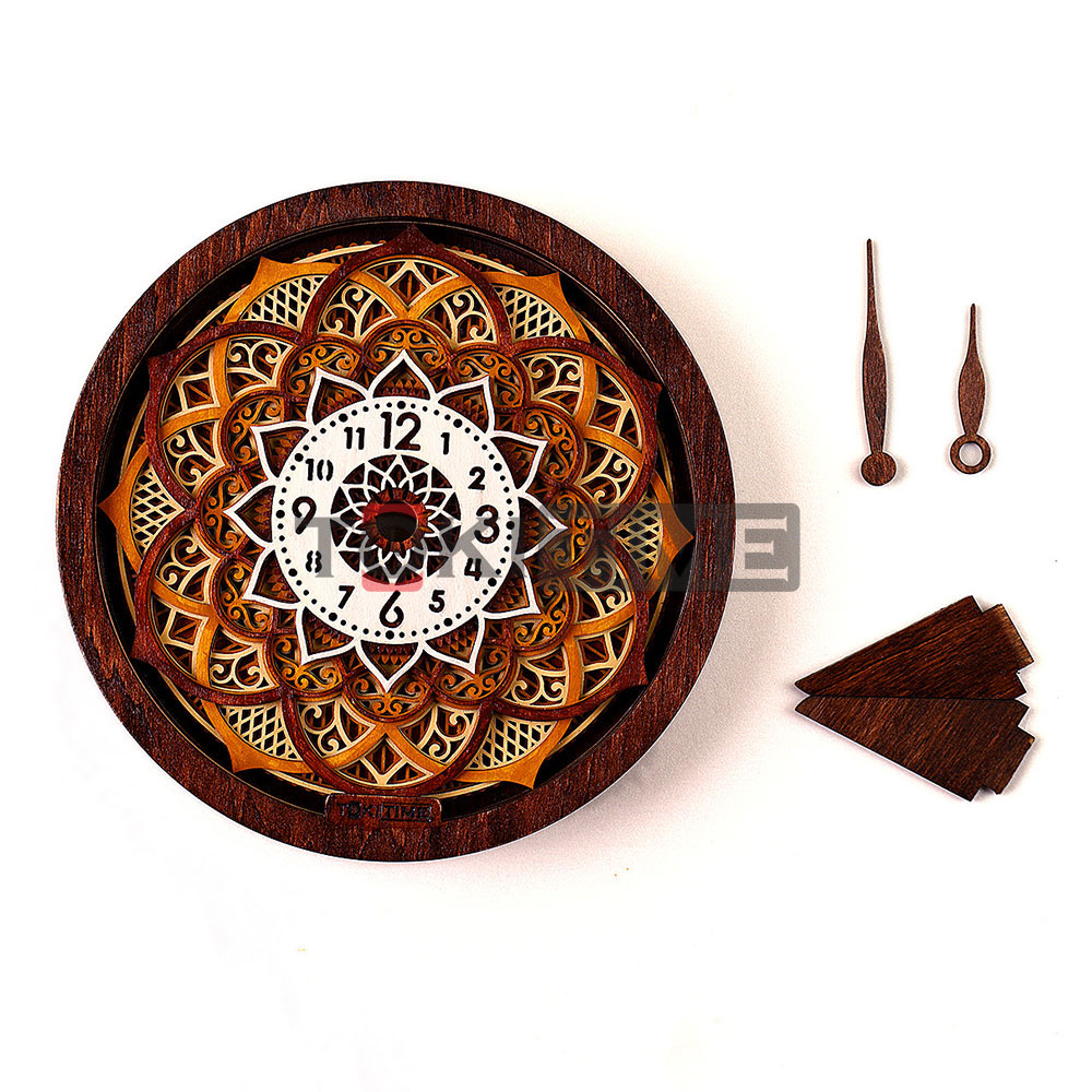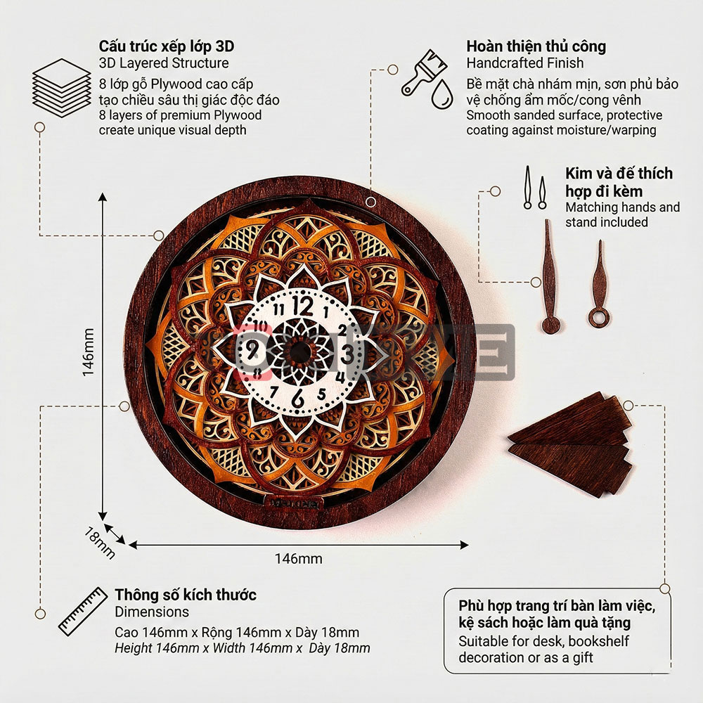 Bộ vỏ đồng hồ gỗ 3D họa tiết được chế tác thủ công từ gỗ Plywood cao cấp, gồm nhiều lớp xếp chồng tạo chiều sâu thị giác nổi bật.
