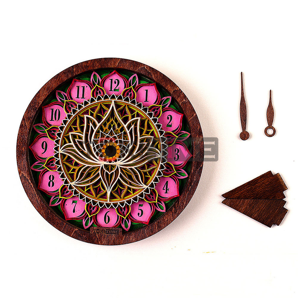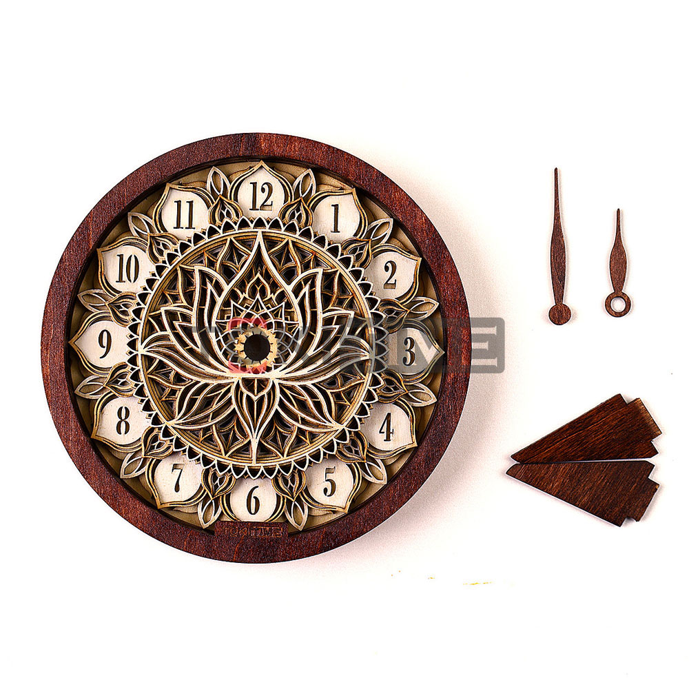 Bộ vỏ đồng hồ gỗ 3D họa tiết được chế tác thủ công từ gỗ Plywood cao cấp, gồm nhiều lớp xếp chồng tạo chiều sâu thị giác nổi bật.