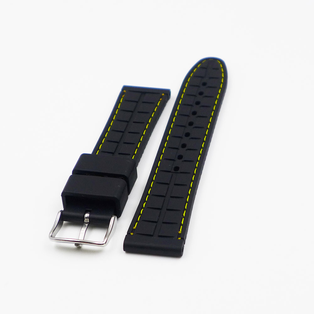 Dây đồng hồ cao su đen chỉ vàng được thiết kế phù hợp với các chiếc đồng hồ có mặt màu vàng hoặc viền mặt màu vàng. Dây có các vân rãnh mặt sau giúp thoáng khí, dễ chịu khi đeo thời gian dài. Dây dày trung bình dễ đeo . Dây cũng dễ dàng làm sạch với khăn ướt.