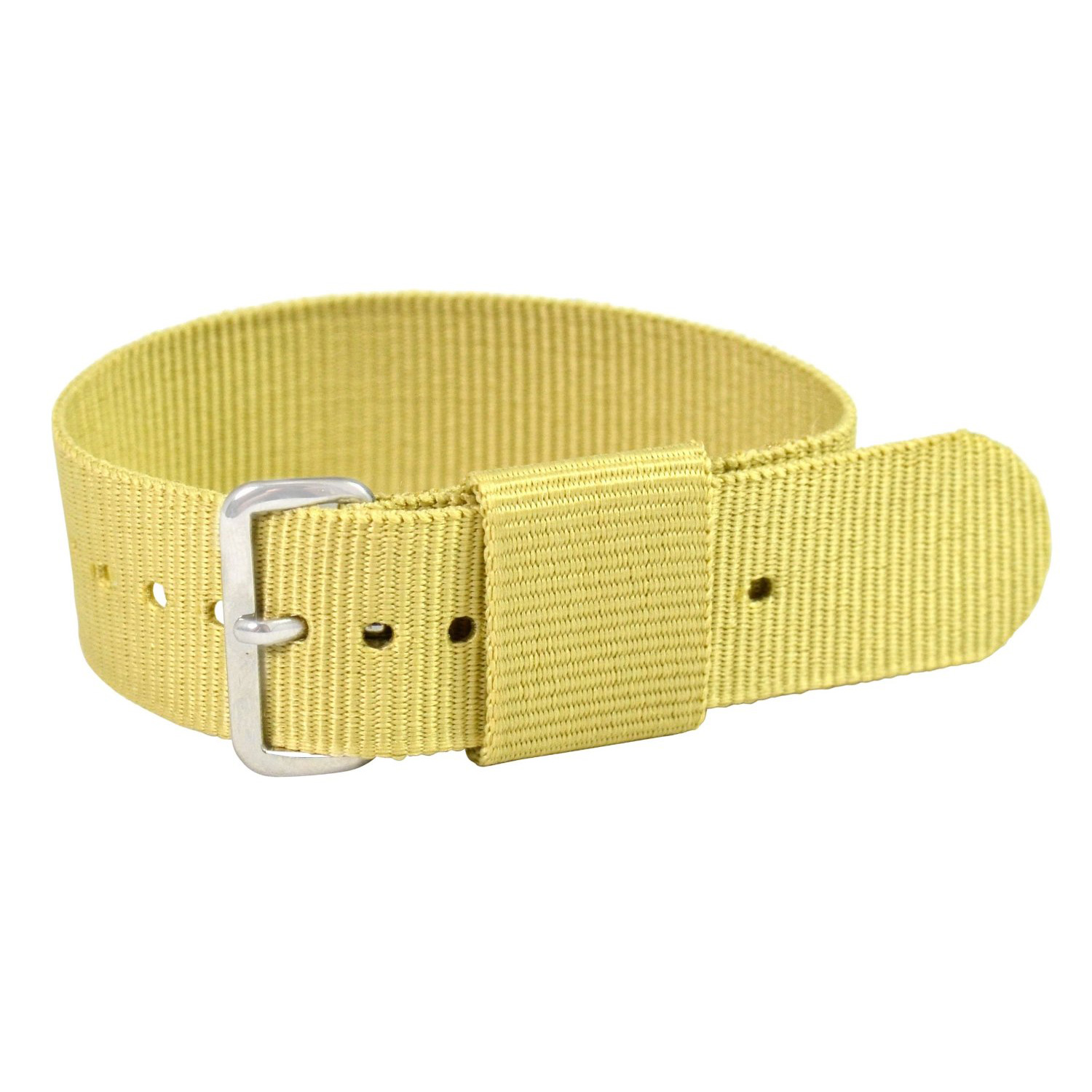 Dây vải NATO màu Kaki cỡ dây 20mm phù hợp với mọi loại đồng hồ cỡ khóa dây 20mm. Dây sản xuất từ các sợi nylon cao cấp chống thấm nước. Dây được cắt và hàn laze đảm bảo độ chi tiết của dây. Khóa cài trên dây làm bằng Inox đảm bảo độ sáng bóng và chắc chắn. Ring vải thay cho kiểu ring Inox giúp dây nhẹ hơn. Dây thường được sử dụng trong quân đội nhưng hoàn toàn phù hợp với thời trang hàng ngày cũng như bơi lặn. Dây có thể tháo ra giặt khi bẩn.