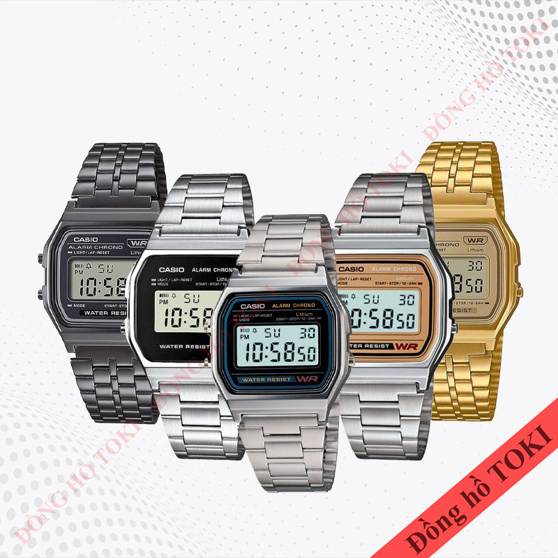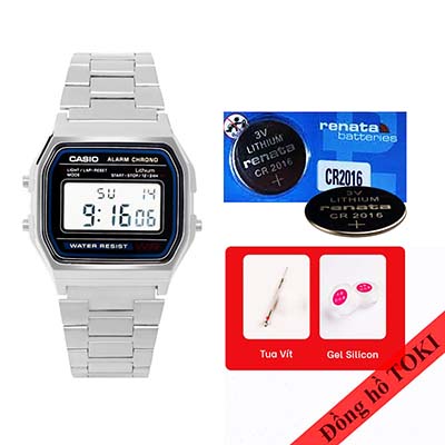 - Casio A158WA là một trong những mẫu cơ bản giá rẻ của casio, hãng hiện bán ra nhiều màu, mỗi màu được phân biệt bằng các mã đuôi khác nhau tuy nhiên tất cả các mẫu đều cùng trang bị một model máy chung và sử dụng pin CR2016.